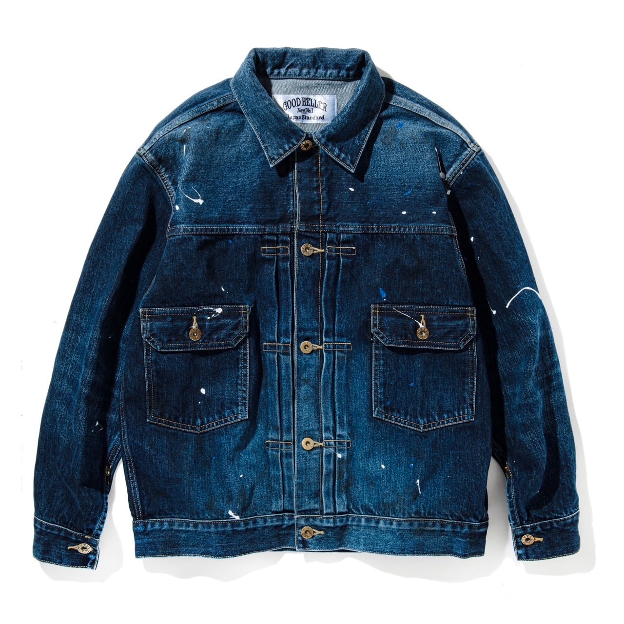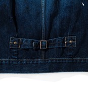 程良いユーズド感を出す為に、ストーンウォッシュ、ヒゲ加工、オイルとペンキ加工を。岡山児島の職人技が光るユーズド加工を施したデニムのセカンドタイプジャケット。生地は14.5ozのデニム地を使用し、フロント両胸のフラップポケットにゴールドの月桂樹ボタンを採用。ワイドシルエットの為、背面中央にハギを入れたT仕様のシンチバック付きのタイプに。1st,2ndと両方の面影を取り入れた新しいビンテージデニムジャケットに。