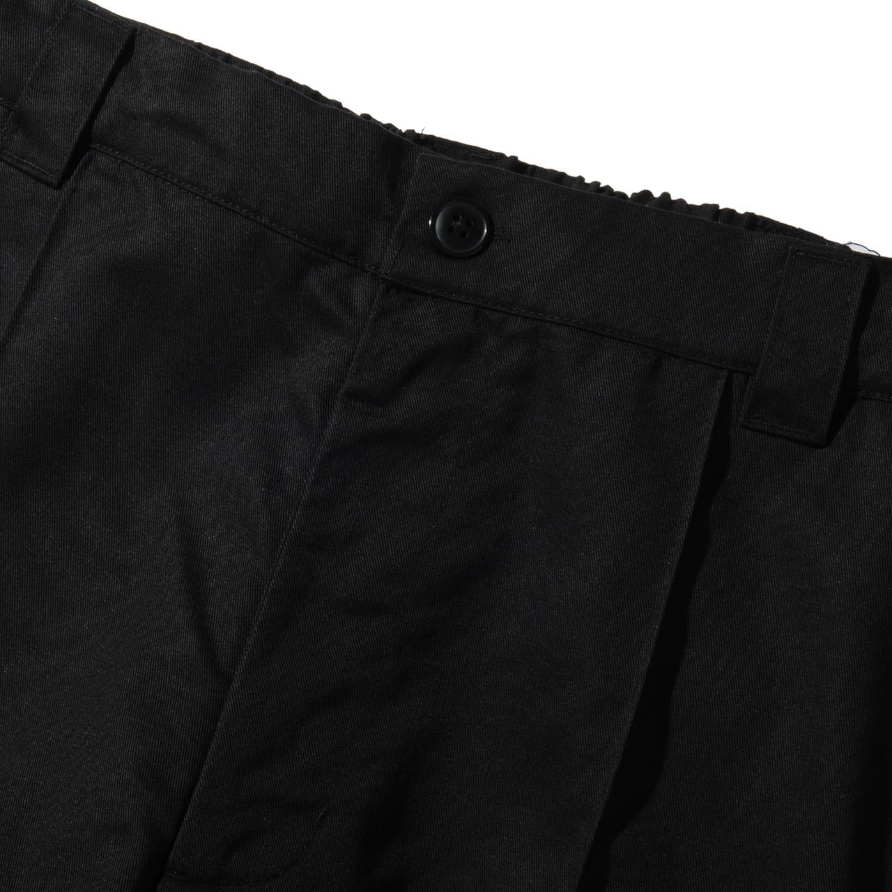 程良い厚さのT/Cツイル地を採用。シルエットは股上深めで、裾に掛けややテーパードの入ったワイドストレートタイプに。ウェスト部分はゴムバンド、ベルト紐、ベルトループ付きのイージーパンツタイプと履きやすさを考慮。またフロントのウェストから裾に掛け縦のピンタックが良いアクセントに。バックのポケット上にはブランドタグ。裾は5cm幅の折り返しのトラウザー仕様に。