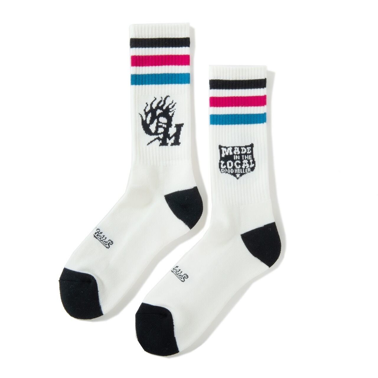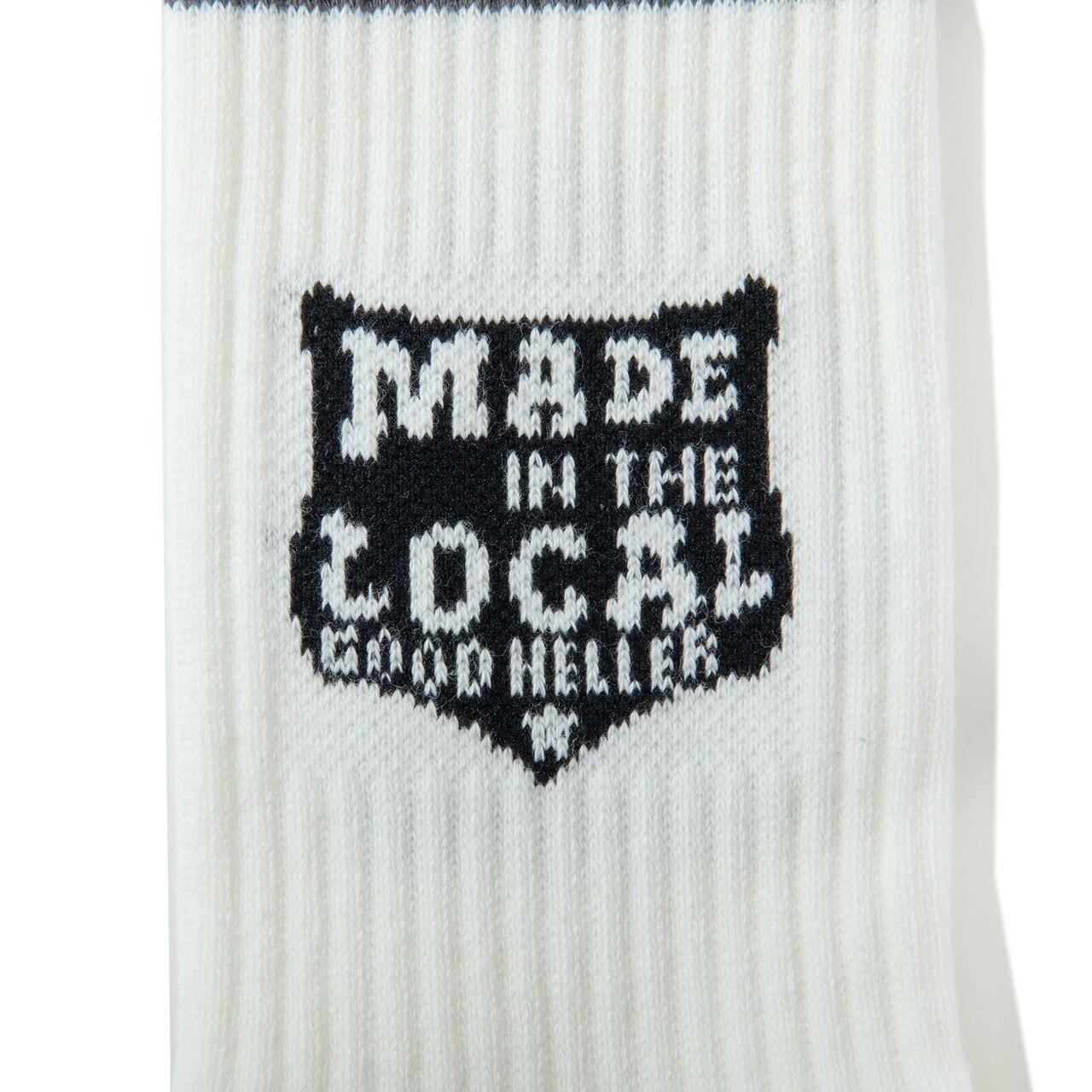 コットン100%の肉厚パイルのリブソックスにジャガード編みにてオリジナルのGHロゴ、”内側にも"MADE IN THE LOCAL"の定番ロゴを、トゥー部分にはメインロゴを。ミドル丈ソックスの完成。アメリカをどこか思わせるラインカラーもまた魅力では。これからのシーズンにさり気ないアクセントとして是非。