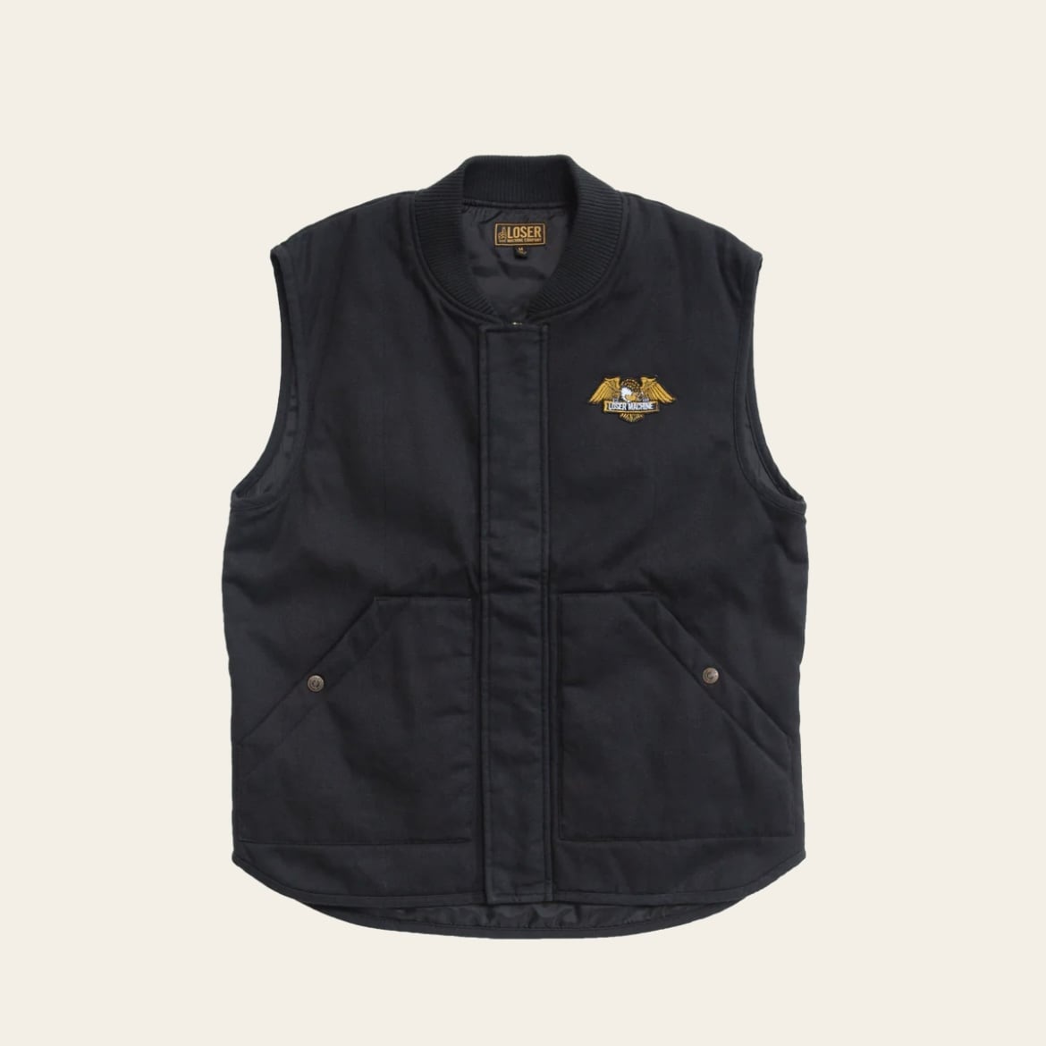 フロントはジップとストームフラップ仕様で風の侵入を防ぎ、パッチポケットにはロゴ入りスナップボタンを配置。内ポケットはキークリップ付きのデュアル仕様。胸元には刺繍のCondorパッチ、Loser Machineのスナップボタンやワッペンも存在感を演出します。