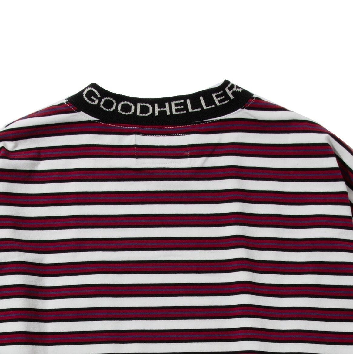 程良い肉感のコットンボディに太細の黒赤白の配色ボーダー。シルエットも以前に比べ着丈を短く調整。身幅や腕周りは着易さ重視で以前と変わらずややゆったり目に設定。首元のリブはオリジナルで作製し、背面部分にはブランドロゴをジャガード織りにてアクセントに。フロント左胸にはポケット付き上部にはロゴ刺繍。シンプルながらインパクトあるボーダーロンTに。