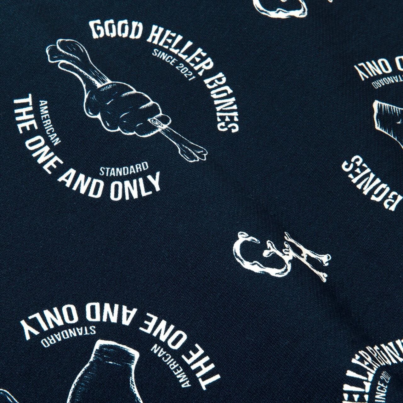 12.4ozの肉厚な裏パイルのスェット生地をオリジナルのボーン柄で総柄プリントしたスウェットパンツは。太過ぎないシルエットでやや太腿から裾にかけてテーパードをかけたストレートタイプにまた裾のゴムはややキツめに設定することで綺麗なシルエットでの着用可能に。背面のスクエア型ボケット裾にはロゴピスネーム。ウェストゴム部分の右端にはベルトループを。シンプルながら存在感ある一枚に。