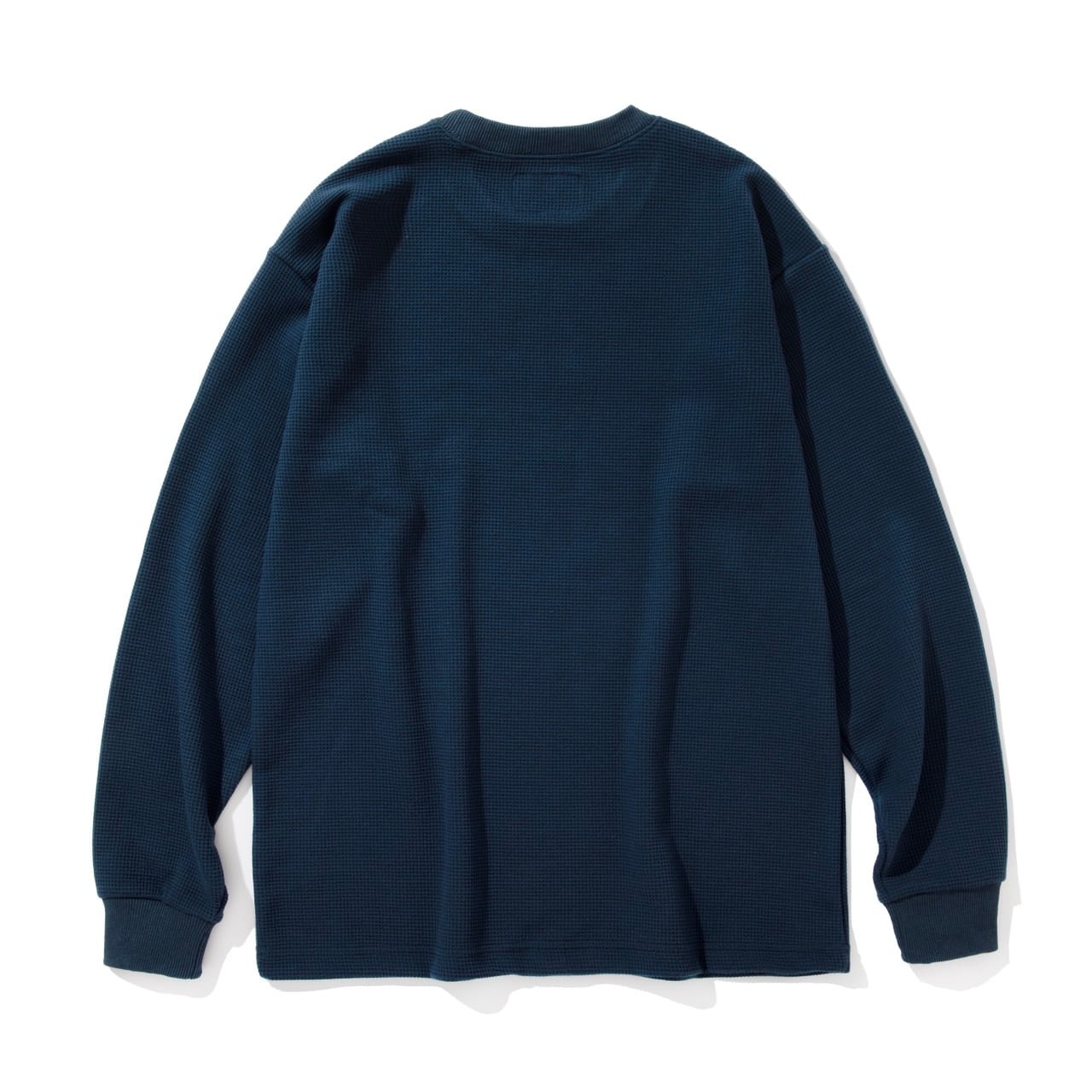 程良い肉感で着心地の良いサーマル地を使用したロングTシャツはシーズン関係無しにインナーとしても重宝出来るのでは。シャツやアウターのフロント開けの際さり気無くアクセントになるように単色カラーにてロゴをプリント。