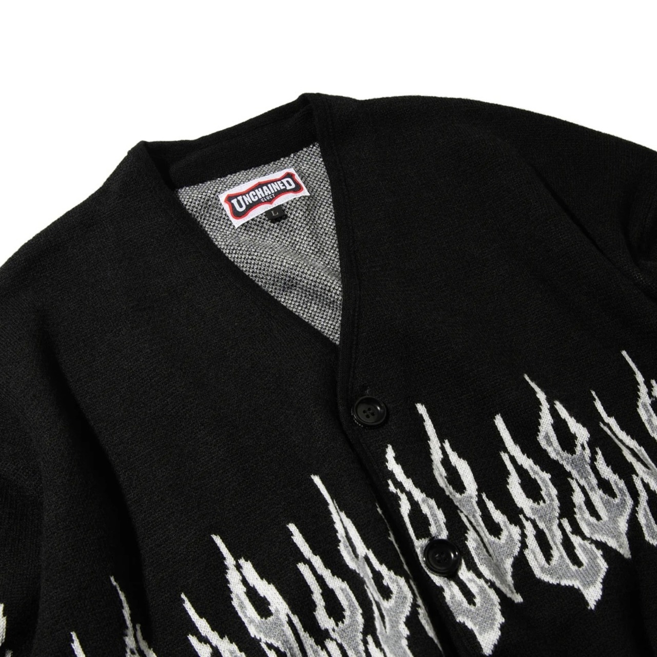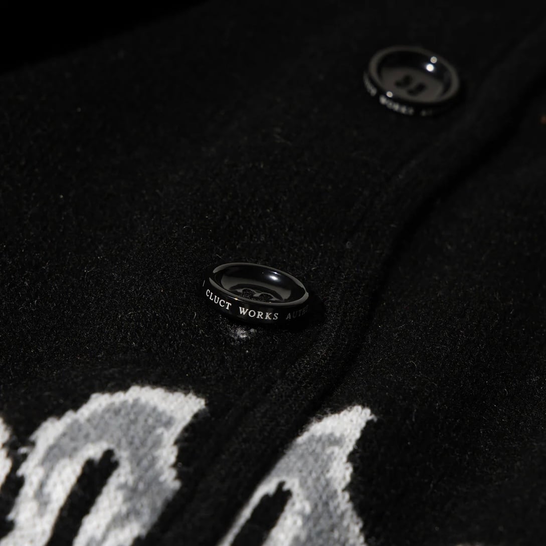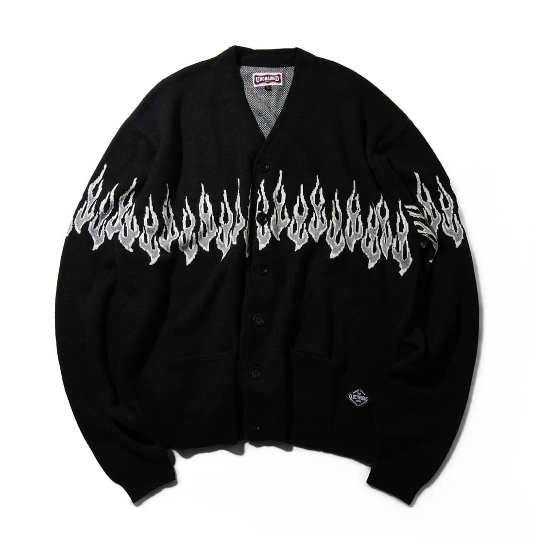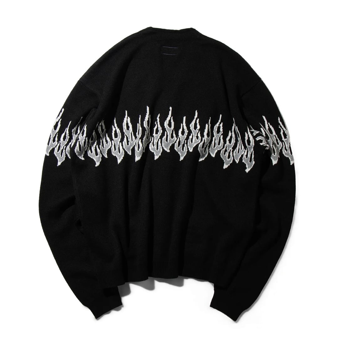 ファイヤーパターンをシックに配色したインパクトのあるニットです。オリジナルボタンなど細部にも拘っています。