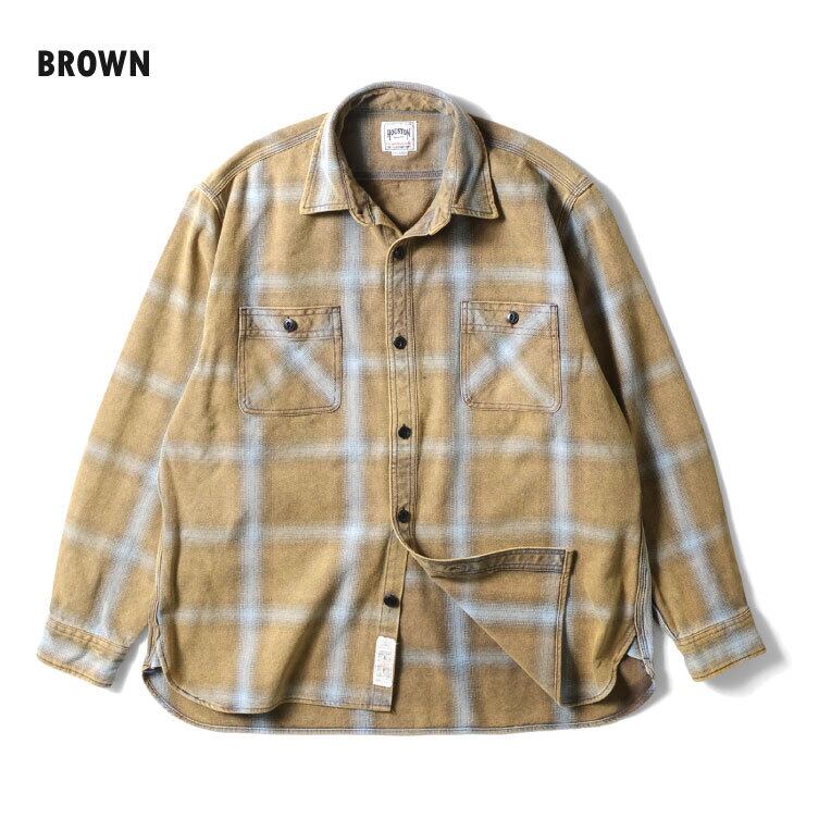 HOUSTON秋冬の定番アイテム【ビエラシャツシリーズ】。ヘヴィーオンスなビエラ生地を使用し、着込むほどに経年変化も楽しめる。トリプルステッチやユニオンチケットなどビンテージライクなディティールが満載。通常細い糸を使用して作成するオンブレチェック柄を、無理やり太い糸で織り上げて表現し、長年着用したかのようなヴィンテージ加工が施されている。