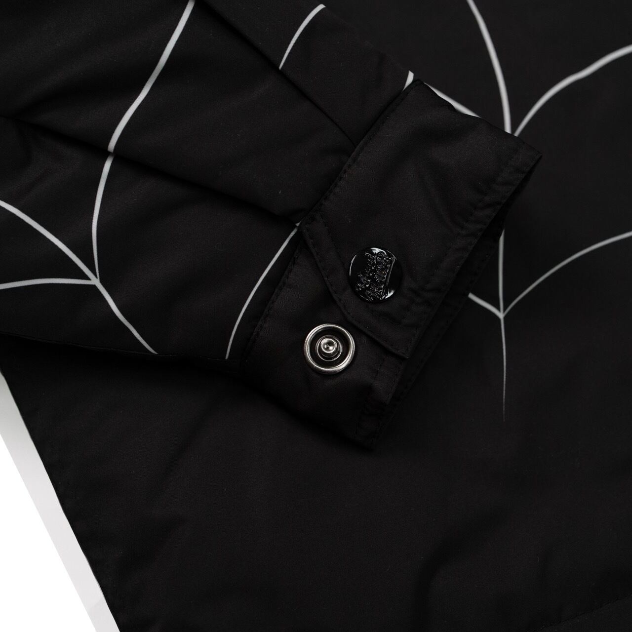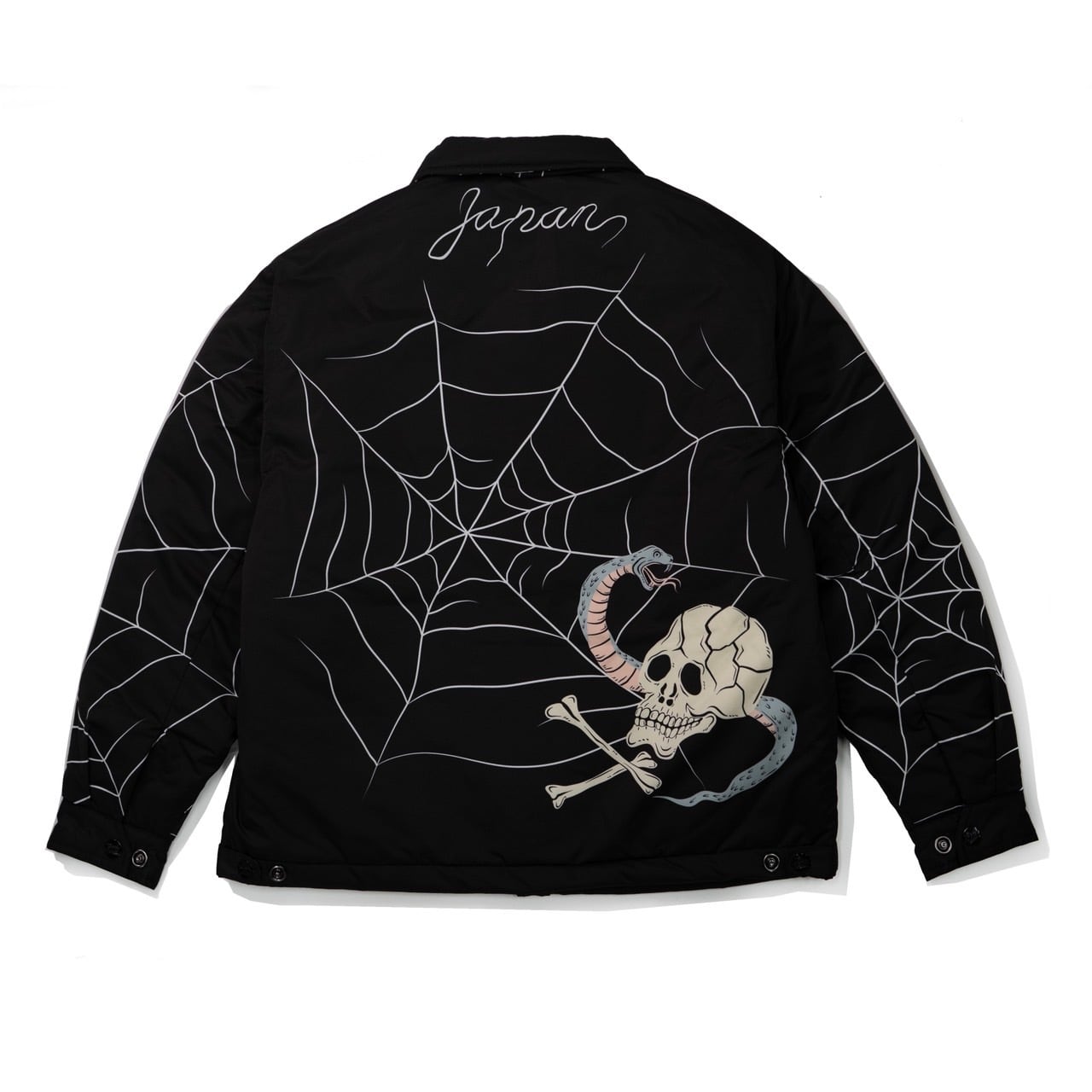 フロントと背面中央に手書き感のあるざっくりとしたスパイダーウェブ、裾にビンテージスカジャンに見受けられるスカルスネークをさり気なく落とし込んだパネルタイプの総柄ジャケット。襟裏にもスパイダーウェブ、スネーク柄でさり気ないアクセントに。生地は肉厚でしっかりとしたポリエステルナイロンを使用し、裏地には光沢感のあるポリエステル地に中綿を入れ保温性を考慮。背面のアジャスター、袖、フロントのスナップ釦はオリジナルスナップ釦を使用。シルエットは定番のコーチジャケットよりも短く、身幅はインナーにヘビーオンスのフーディやニットなど着込むこと考慮しややワイドなシルエットに。