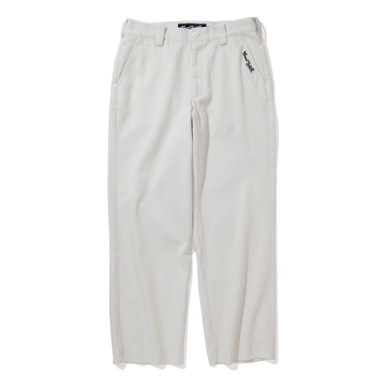 程良い肉感のTCツイル地を使用。股上はやや深めに設定し、ワタリから裾にかけて太くワイドなストレートタイプのシルエットが特徴的。フロントポケット部分にはアクセントでメインロゴを刺繍。カラーリングも糸染めから行いオリジナルカラーにてリリース。