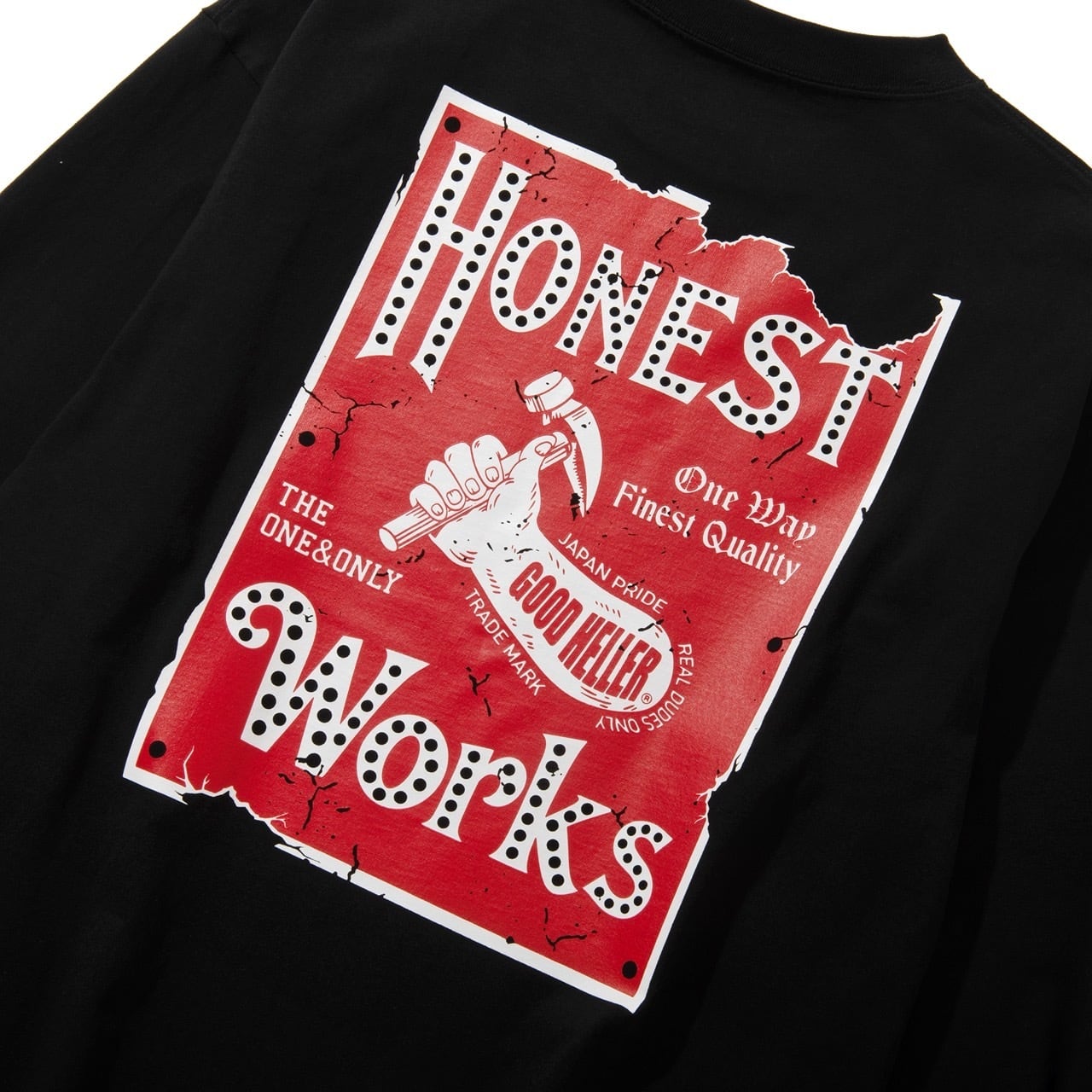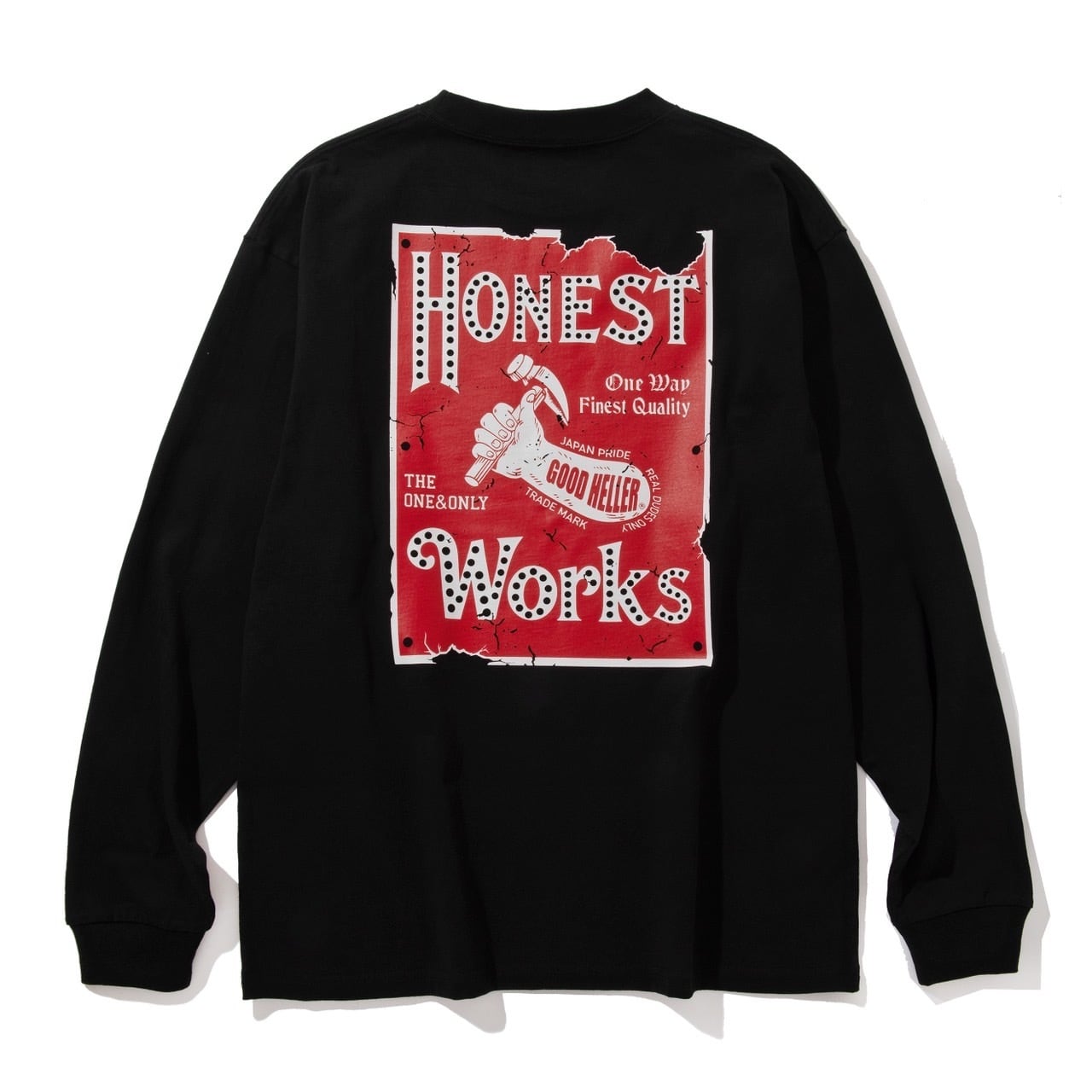 今季より新たに作製したオリジナルロンTは7.5オンスのヘビーデューティでしっかりとした生地を使用し、着丈は以前に比べ短く、身幅、肩幅とゆったりとしたシルエットとなります。背面には”HONEST WORKS”とワークカンパニーのサインボードをイメージし作製したオリジナデザインを大判でシルクプリント。フロントにはワンポイントロゴでアクセントに。ワンウォッシュ加工しており、大幅な縮みはないです。