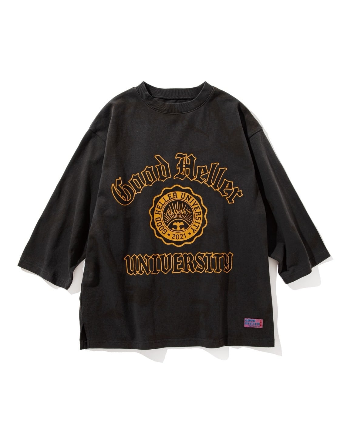 9.5OZのヘビーウェイトボディを使用した七部袖Tシャツは着丈は長すぎず、アームホール、身幅はややゆったりとした着易さ重視のシルエットとなります。フロントにはGOOD HELLER UNIVERSITYと架空の大学名をフロッキーとシルクスクリーンにてカレッジロゴをプリントしております。そこから、ビンテージ感をより演出するため、スプレー加工を施し、さらに何度も洗い込むことでフロッキープリントの剥がれも出しております。