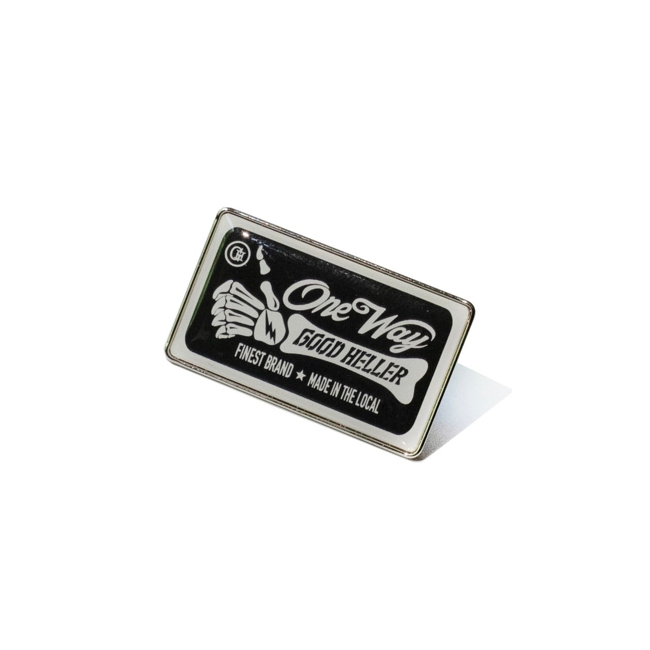 スカルハンドのONE WAY LOGOがプリントされた樹脂シールの長方形ドーム型ピンズ。ベスト、シャツのアクセントに良いのでは。