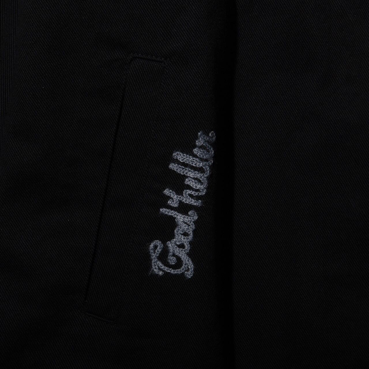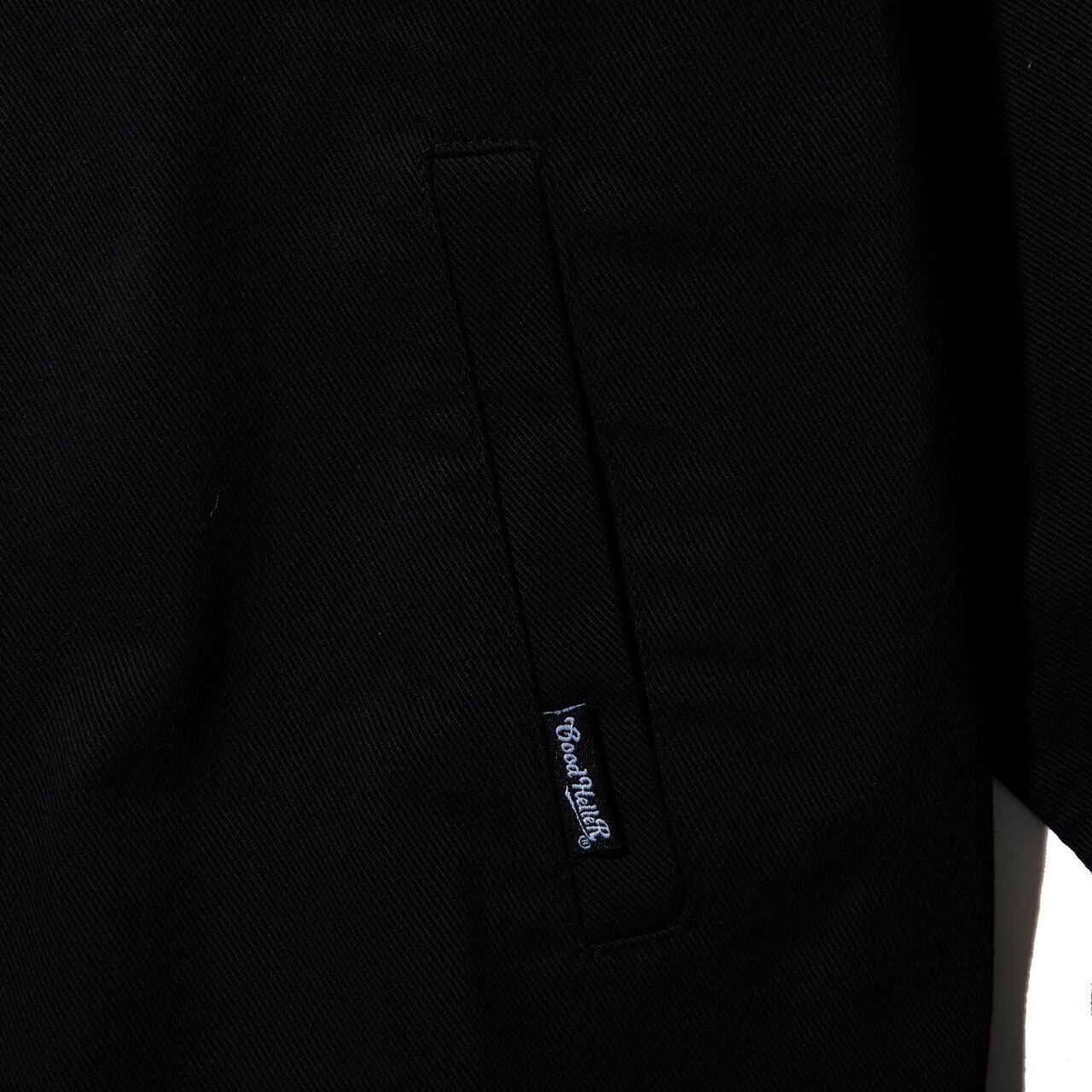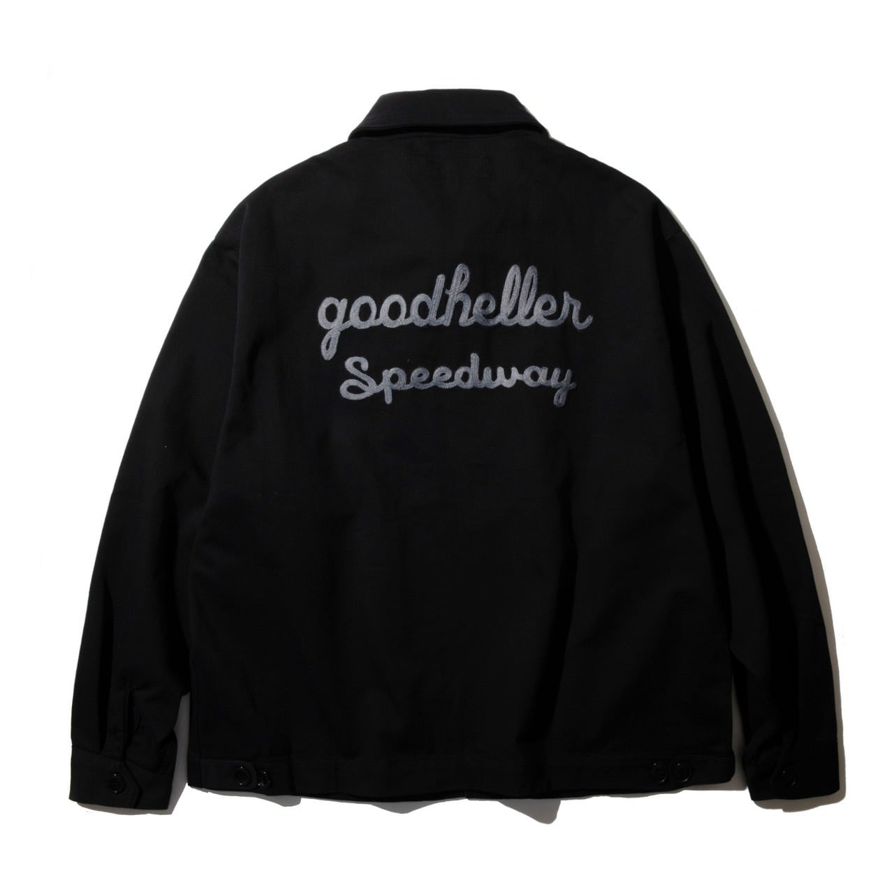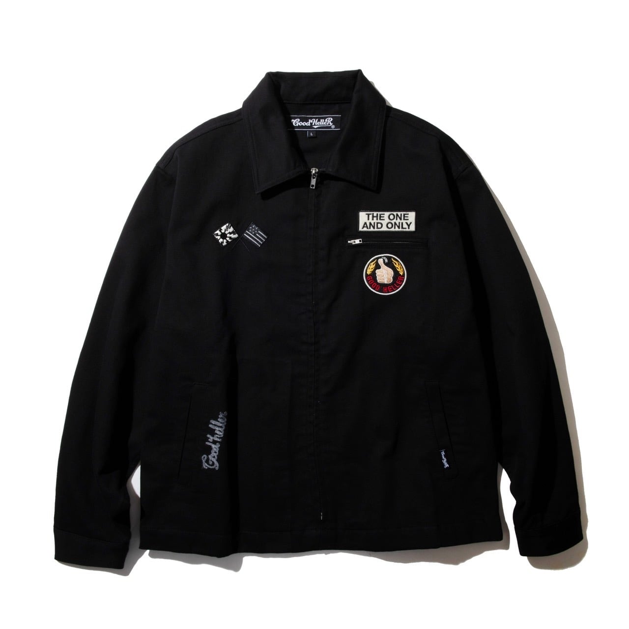 程良い肉感コットンツイル地を使用し、着丈は短く、身幅肩幅とややゆったりなビンテージライクなシルエットに。フロント左胸にはジップポケット。その上下には”THE ONE AND ONLY”とグッドサインのワッペン刺繍。逆サイドにはフラッグロゴを刺繍。またスラッシュポケット添いにはチェーン刺繍でブランドロゴ。背面には”GOOD HELLER SPEED WAY”と大振りなチェーン刺繍をこれからの時期に重宝できる一枚地のジャケットの完成。