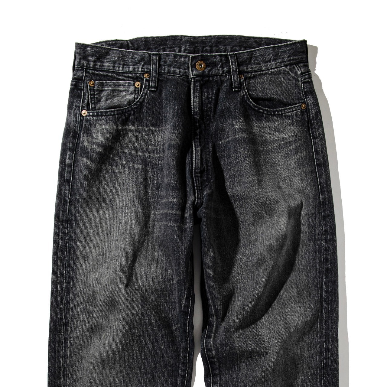 程良いユーズド感を出す為に、ストーンウォッシュ、ヒゲ加工、オイル加工と岡山児島の職人技が光るユーズド加工を施したブラックデニムのストレートデニムパンツ。生地は14.5ozのブラックデニム地を使用し、ストレートタイプの5ポケットデニムパンツは裾やコインポケットのセルヴィッチタイプ、隠しリベット、使いやすさを考慮したフロントジップタイプに敢えての月桂樹ボタンなど、クラシカルな50年代から60年代のアメリカンディテールを組み合わせたモデルに。ウエストから裾にかけて軽いテーパードが入りやや深めの股上になっております。さらにオリジナルのピスネームを。昔ながらのアメリカンストレートタイプにてリリース。