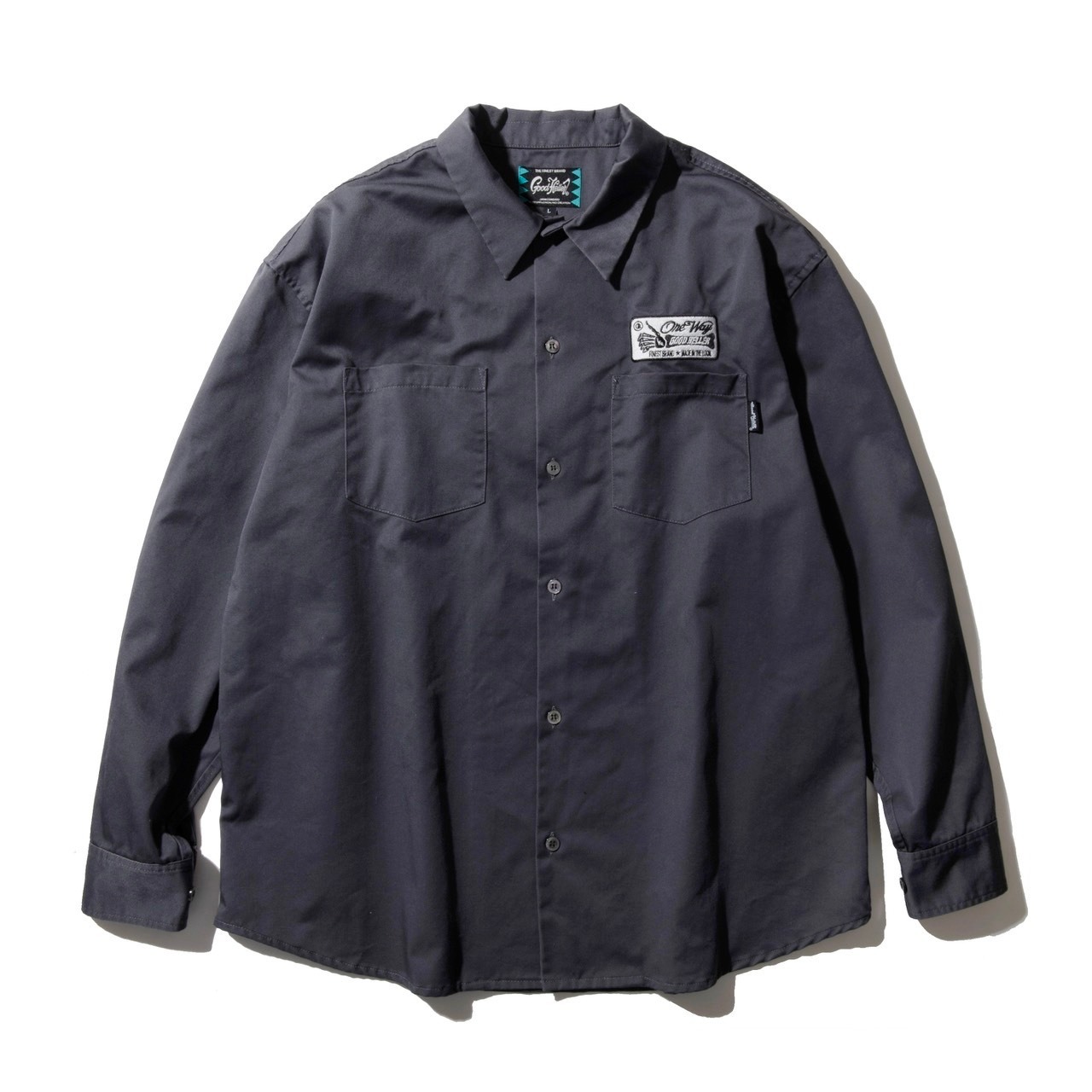 アメリカのブルーワーカーをイメージし作製されたワークシャツは、程良く肉厚なツイルを使用し、裾は緩やかなラウンド仕様に。製品洗いすることで柔らかで着心地の良い仕上がりに。フロント左胸にはONE WAYとワードの入ったグッドサインワッペンをオン。背面には平刺繍にてアーチ型でブランドロゴを施しております。