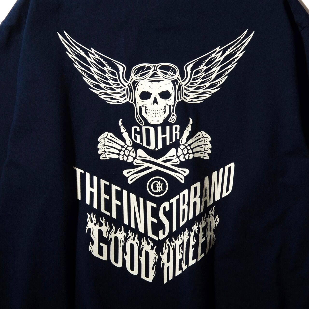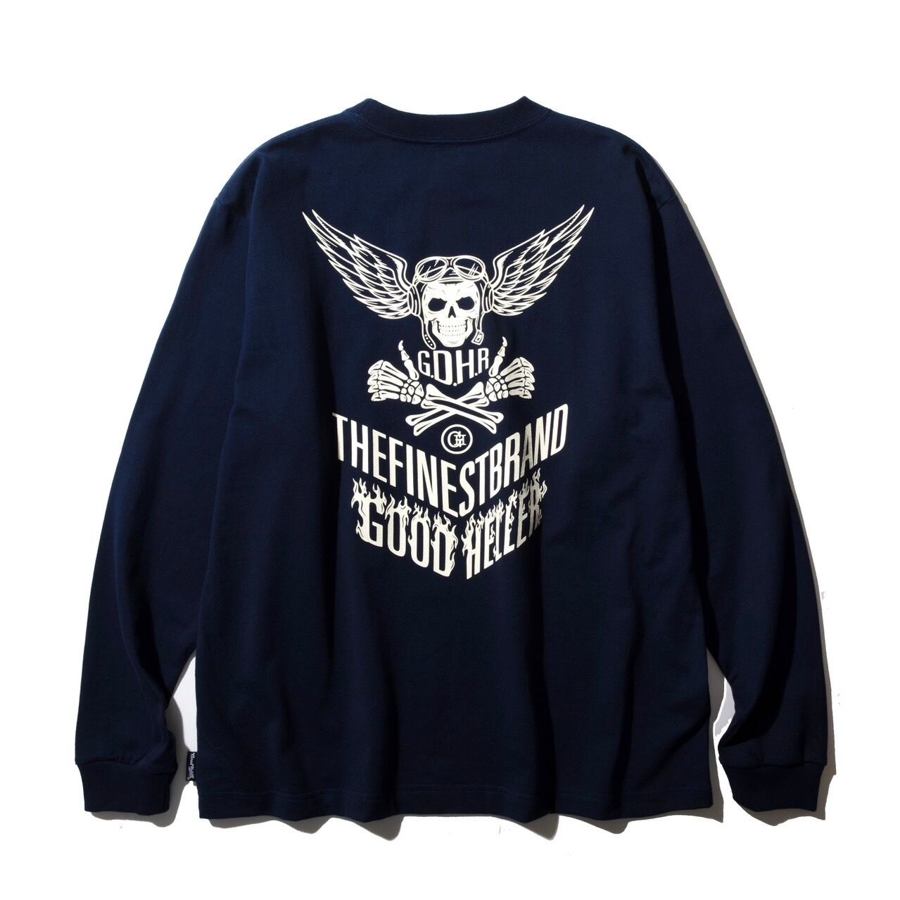 フロント中心にはブランドロゴを。バックにはスカルとウィングを組み合わせたアメリカンテイストなデザインを大判でプリント。ボディは日本国内で作製された9オンスのヘビーオンスのロングTシャツ。肉感、着心地共に申し分ないクオリティーに。