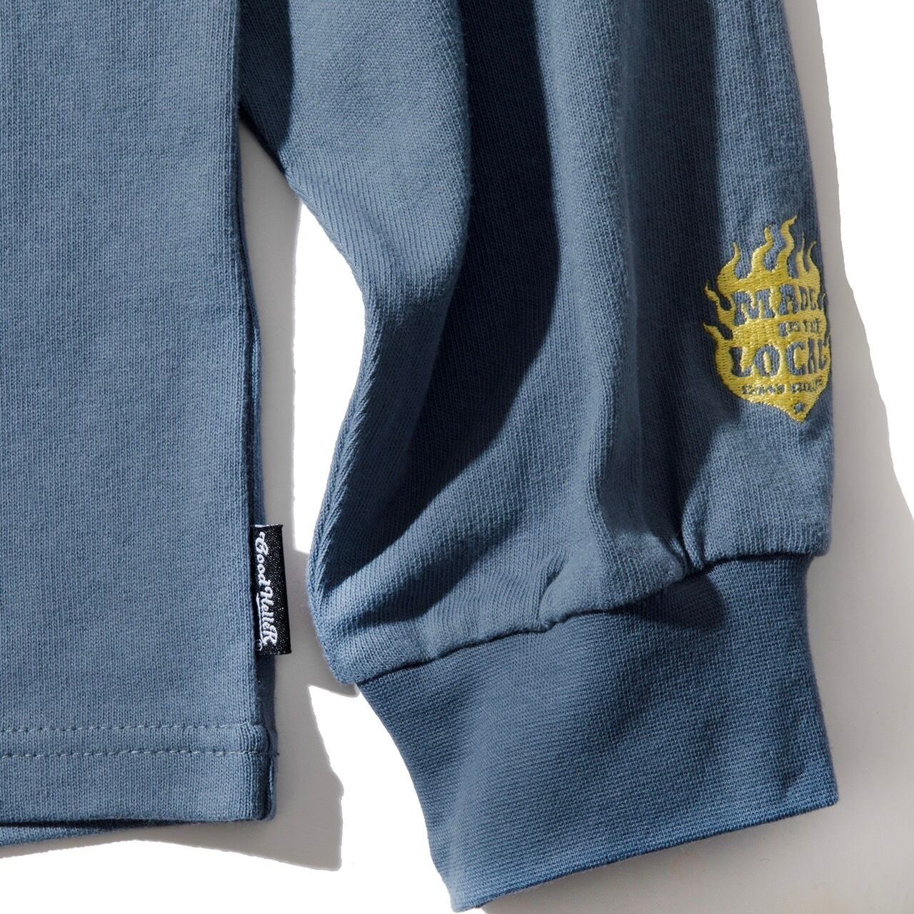 背面には サブタイトルの”THE ONE AND ONLY”を筆で描いた様な動きのある掠れた雰囲気のフォントを作製し、平刺繍にてオン。また左胸には同じくブランドロゴを刺繍。袖には”MADE IN THE LOCAL"の火の玉ロゴをアクセントに刺繍にてオン。シンプルながら贅沢一枚に。オリジナルで作製されたロンティーは7.4オンスの肉厚でドライな雰囲気のあるさっくりした天竺編みコットンを使用し、パターンはややゆったりした前回の定番ロンティーをベースにアーム部分をややゆったりに修正しております。また、生地洗いをしており、洗濯洗いの際も縮率が低くなっております。