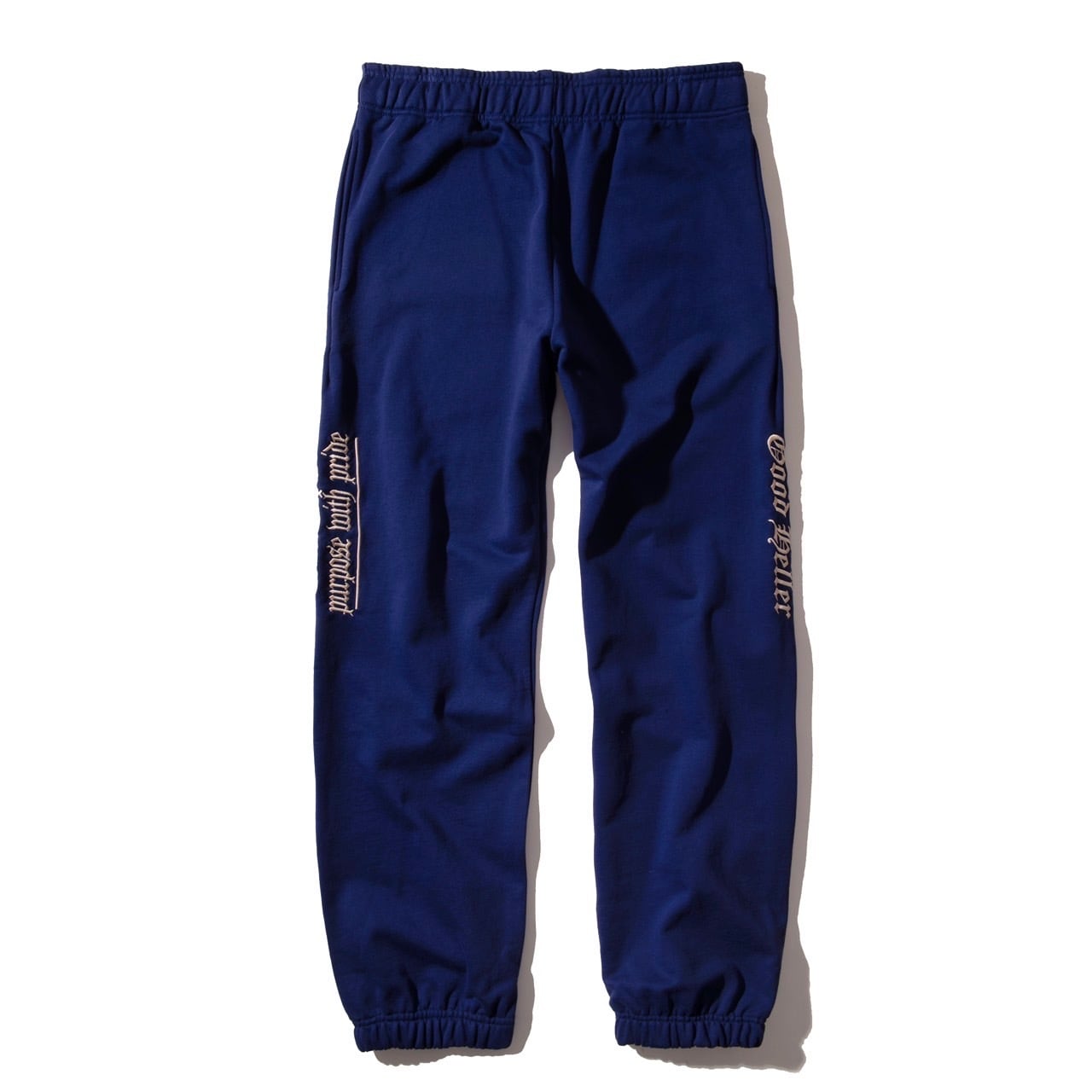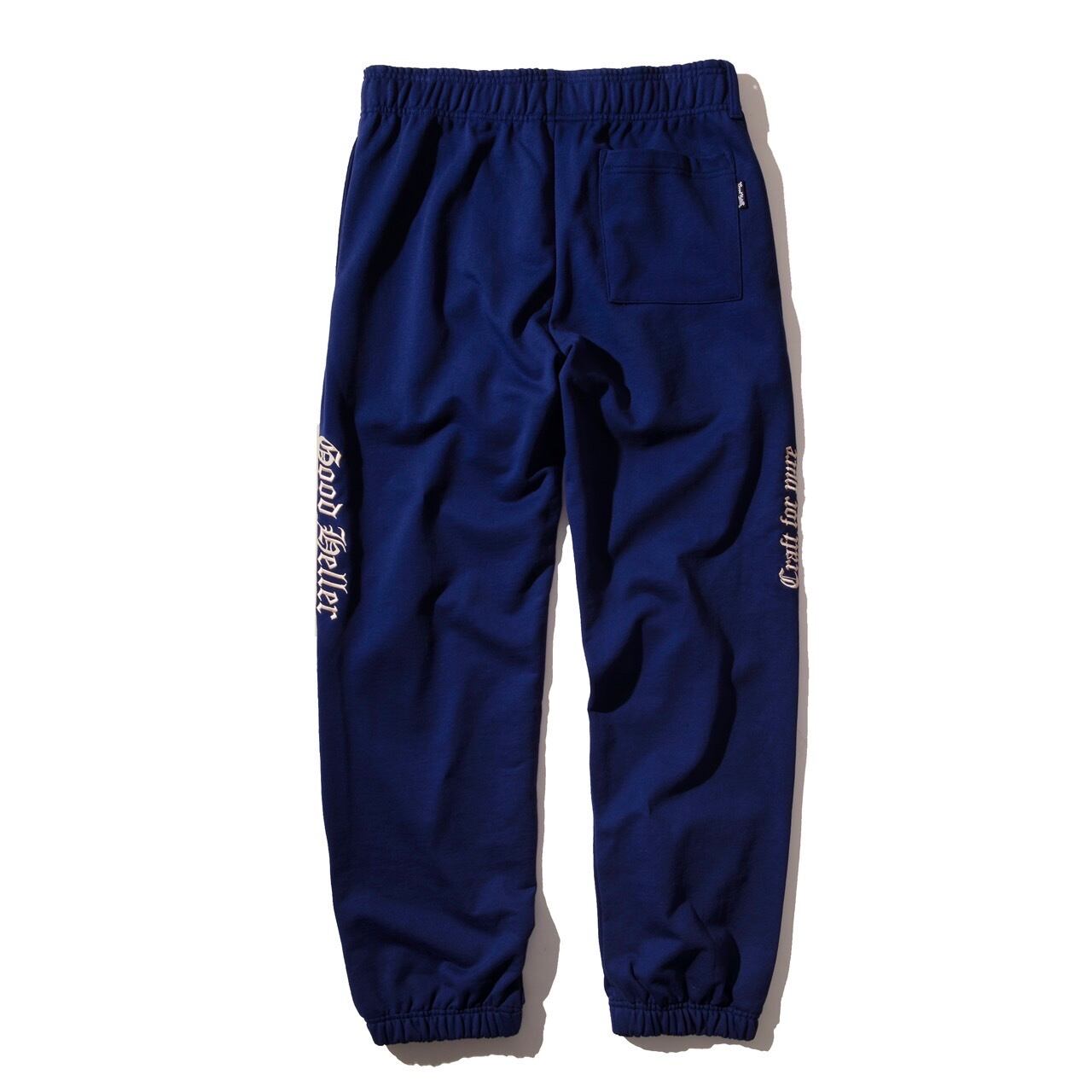 12.4オンスの重量感ある肉厚裏毛スウェットを使用。ブランドロゴ、サブタイトルをオールドイングリッシュのオリジナルフォントにて両サイドに刺繍。ワタリ、ヒップをやや太く、ゆったりとしたシルエットでストレスなく履けるサイズ感に。また裾のゴムはややキツめに設定することで、ゆったりながら綺麗なシルエットでの着用可能に。背面のスクエア型ボケット裾にはロゴピスネーム。ウェストゴム部分の右端にはベルトループを。シンプルながら存在感ある一枚に。
