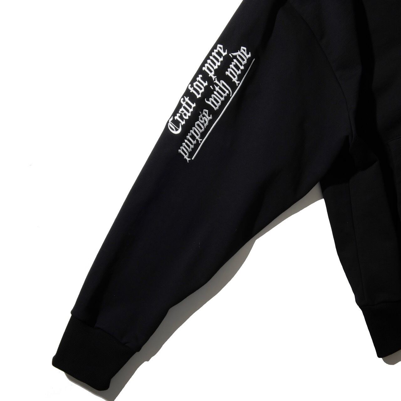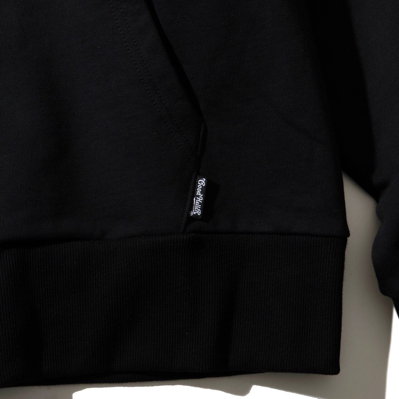 12.4オンスの重量感ある肉厚裏毛スウェットを使用。ブランドロゴ、サブタイトルをオールドイングリッシュのオリジナルフォントにて両腕に刺繍。アームをやや太く、フードも大きめに設定。ストレスなく緩りと着れるサイズ感に。フロントカンガールポケット袖にはピスネームを。シンプルながら存在感ある一枚に。