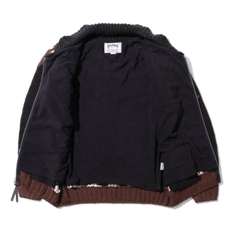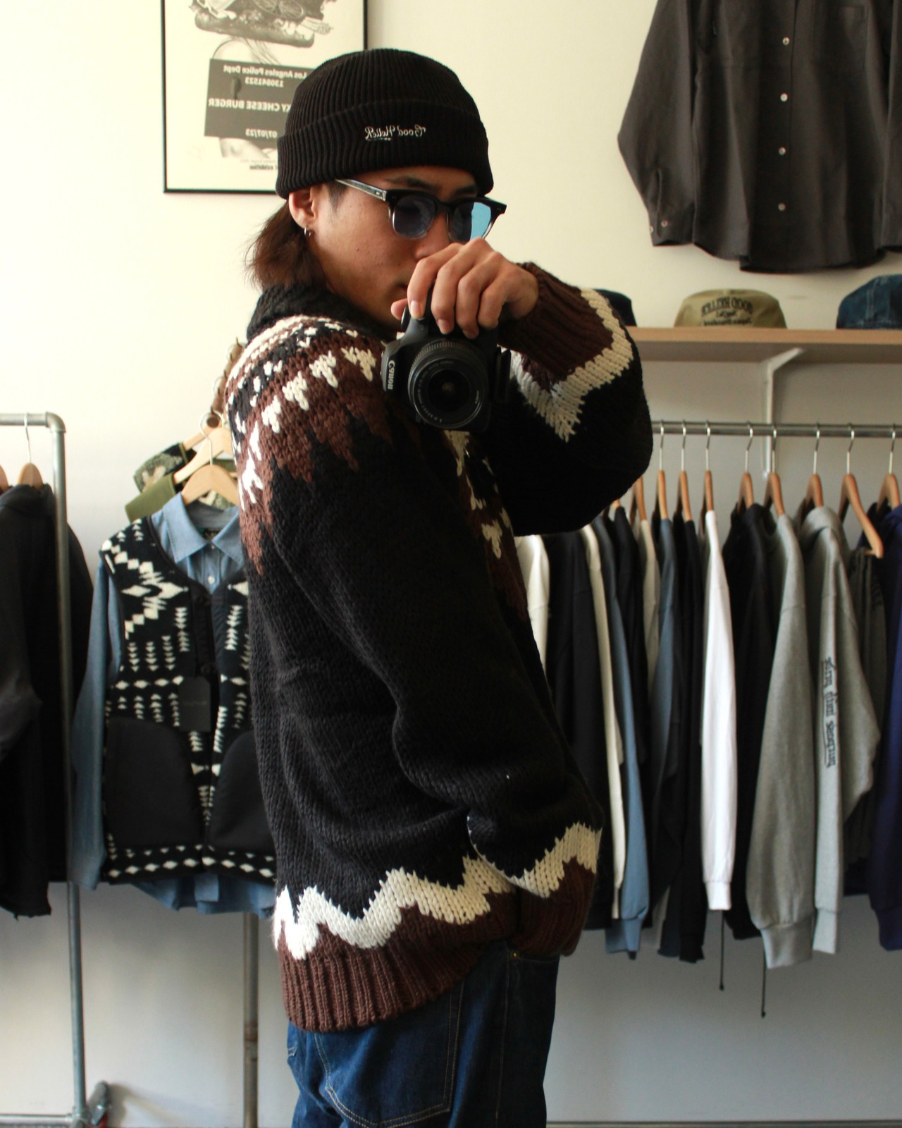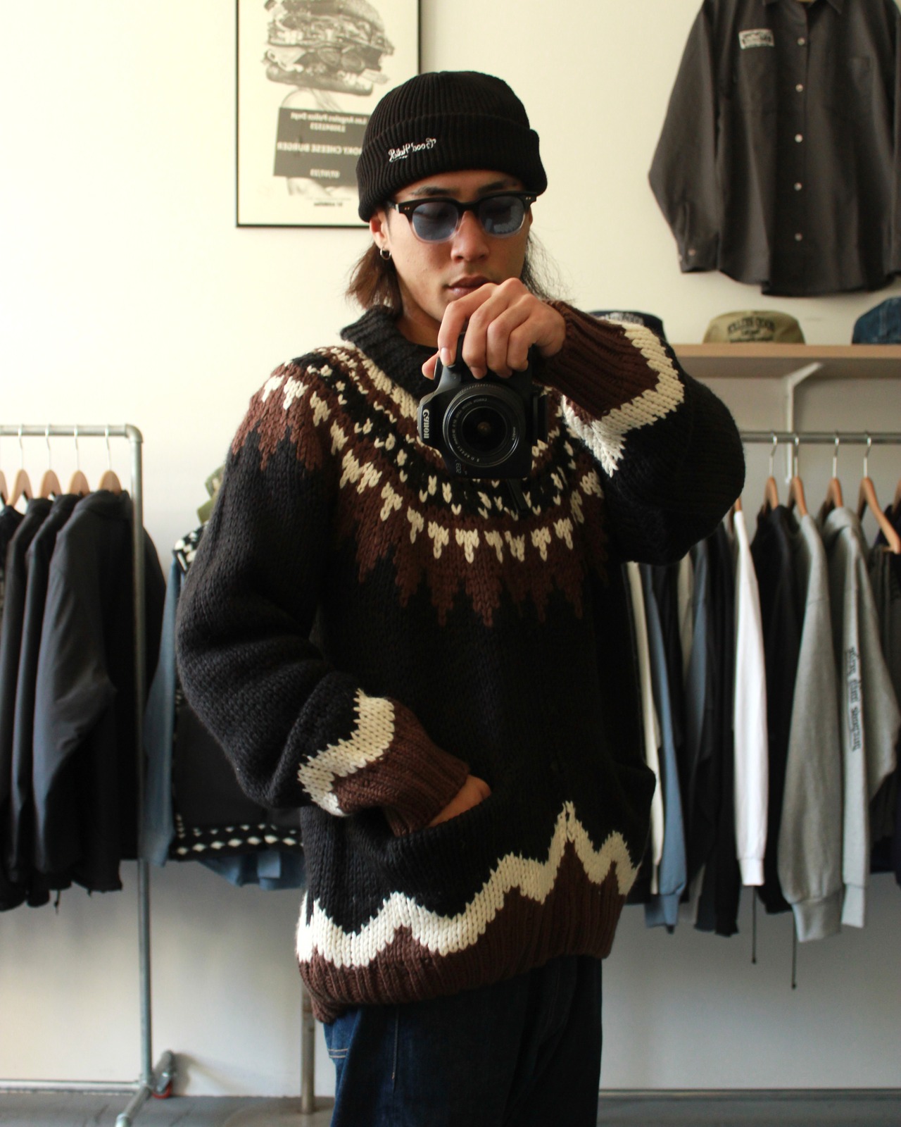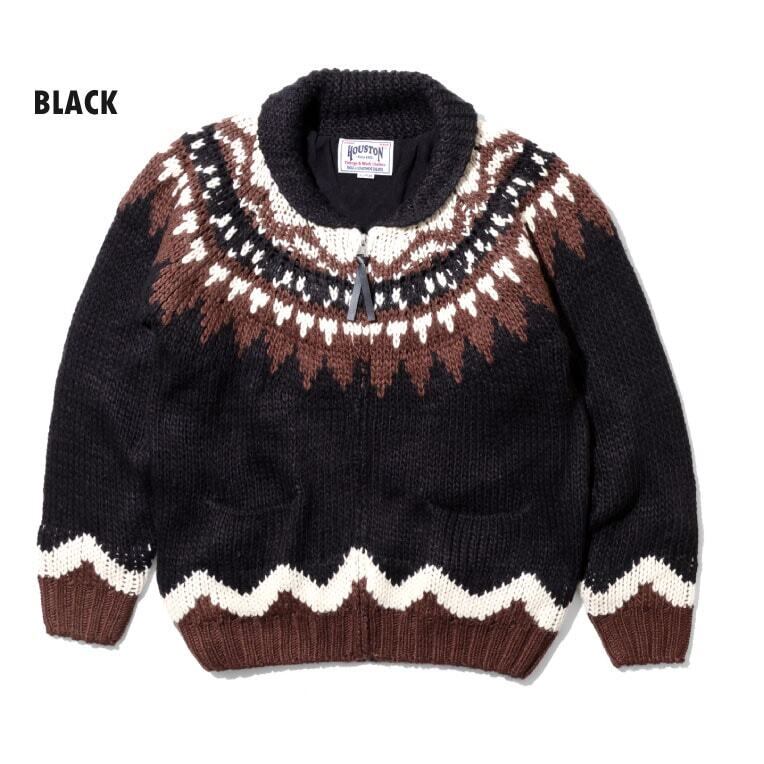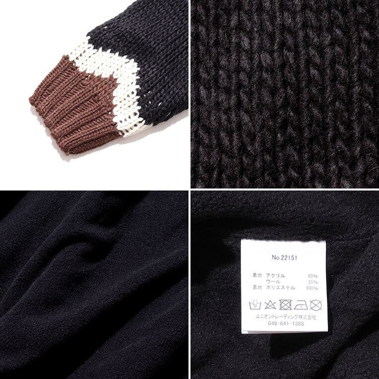 ショールカラーでジップアップ仕様のカウチンニットカーディガン。表地にはアクリルとウールの混紡糸、裏地にはフリースを使用しているので、保温性は抜群。シンプルな求心柄が映える一着。様々なスタイルに合わせやすいデザインに仕上げている