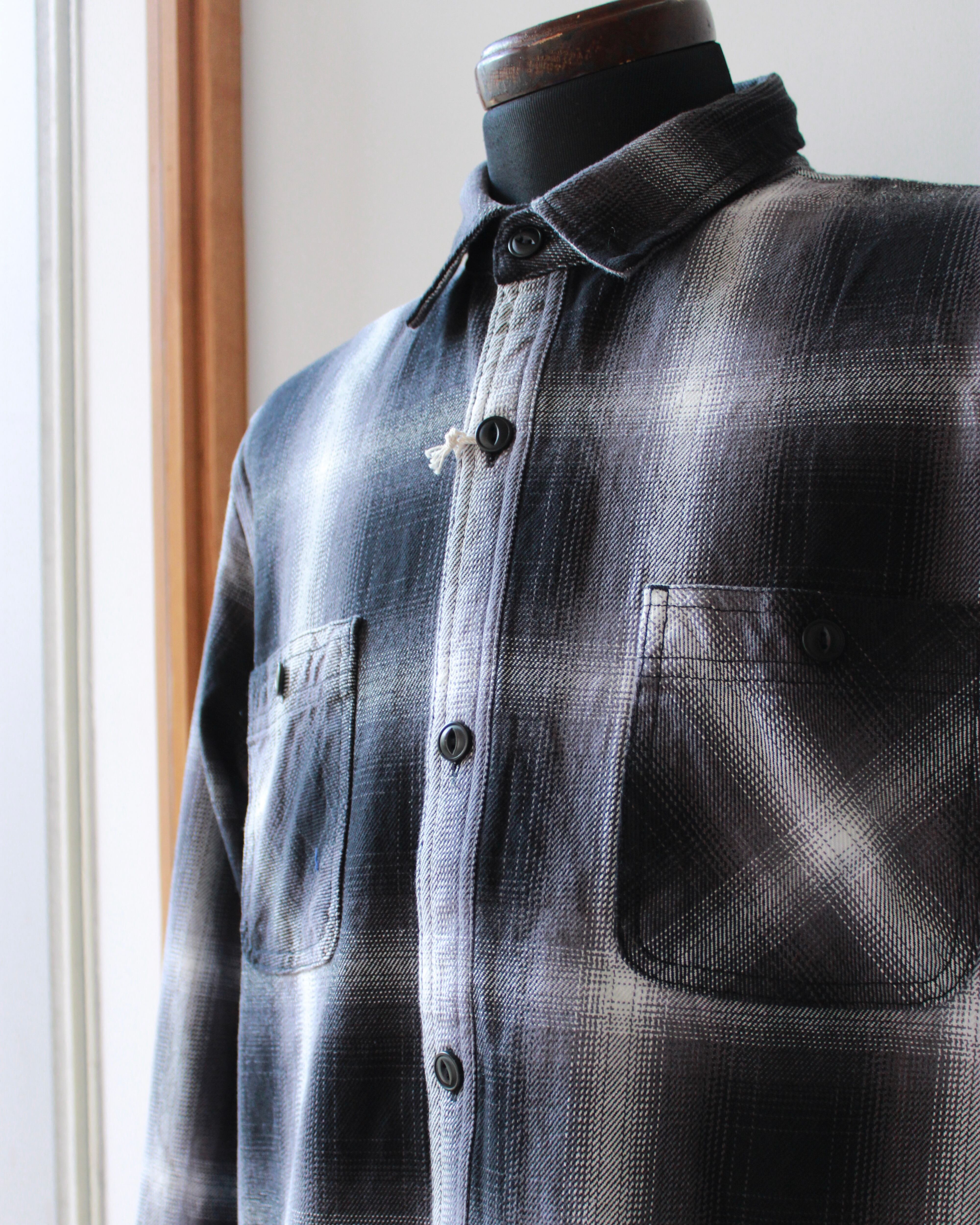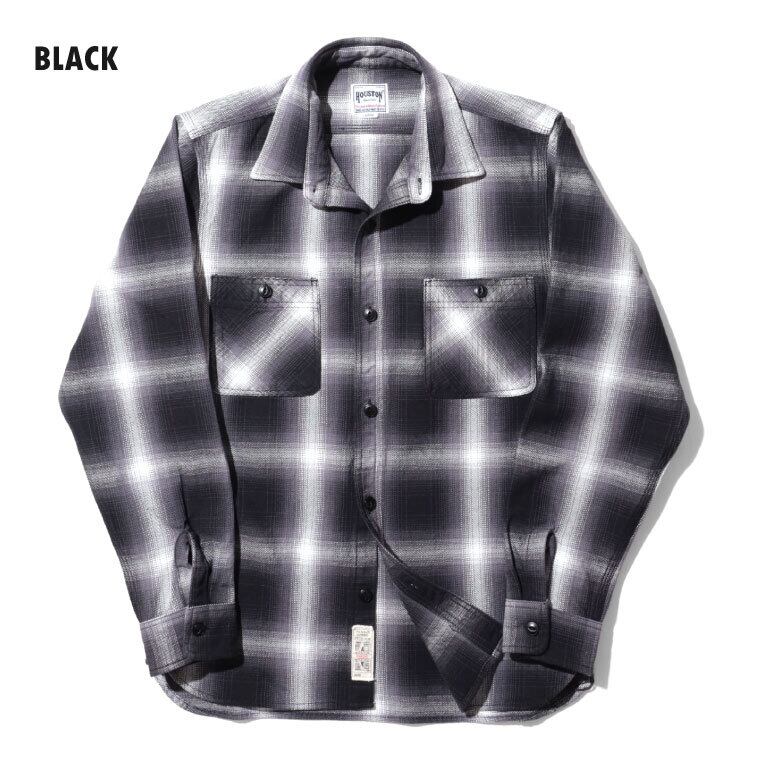 HOUSTON秋冬の定番アイテム【ビエラシャツシリーズ】。ヘヴィーオンスなビエラ生地を使用し、着込むほどに経年変化も楽しめる。トリプルステッチやユニオンチケットなどビンテージライクなディティールが満載。細い糸を使用して作成するグラデーションが美しいオンブレーチェックをあえて太めの糸を使用して織り上げて表現している。