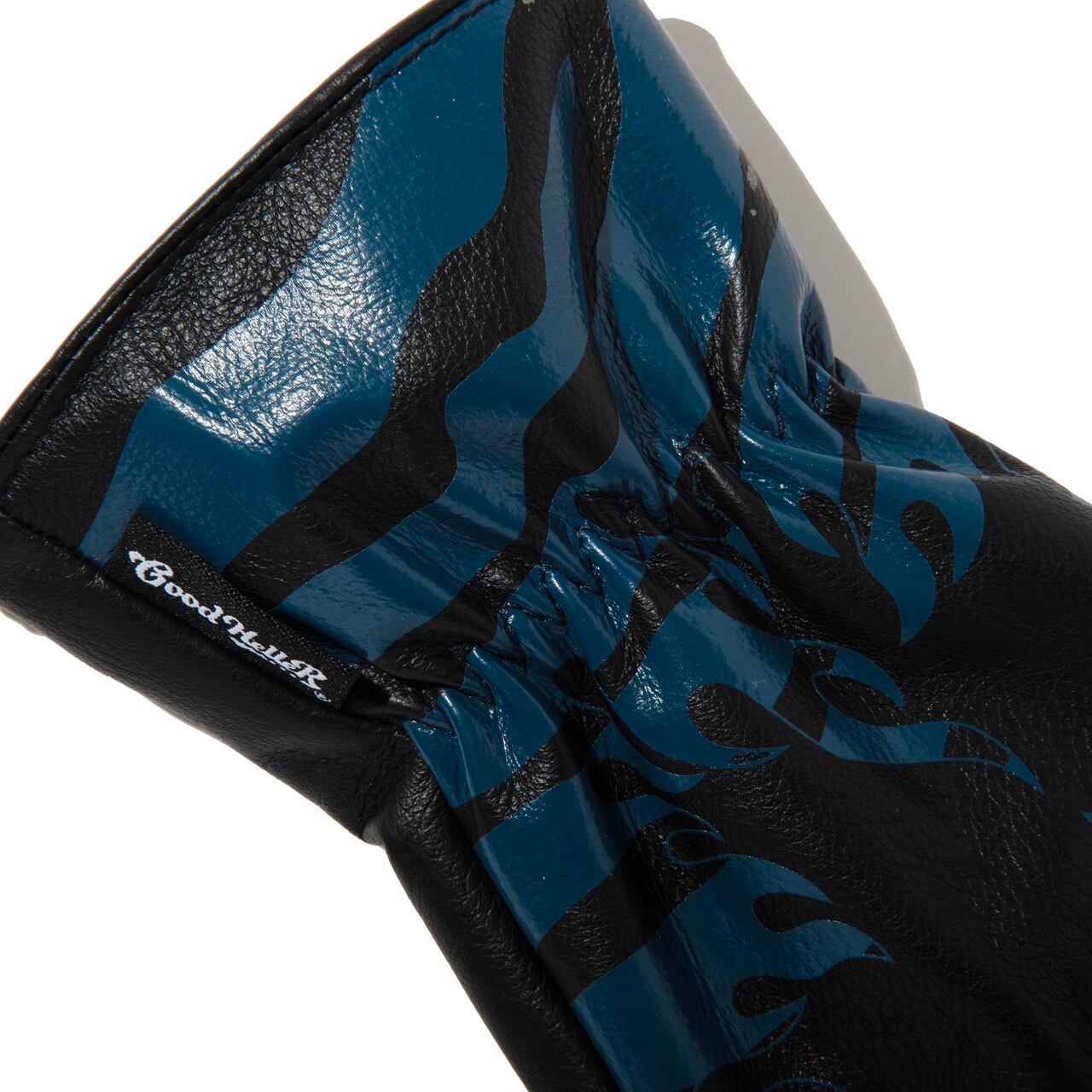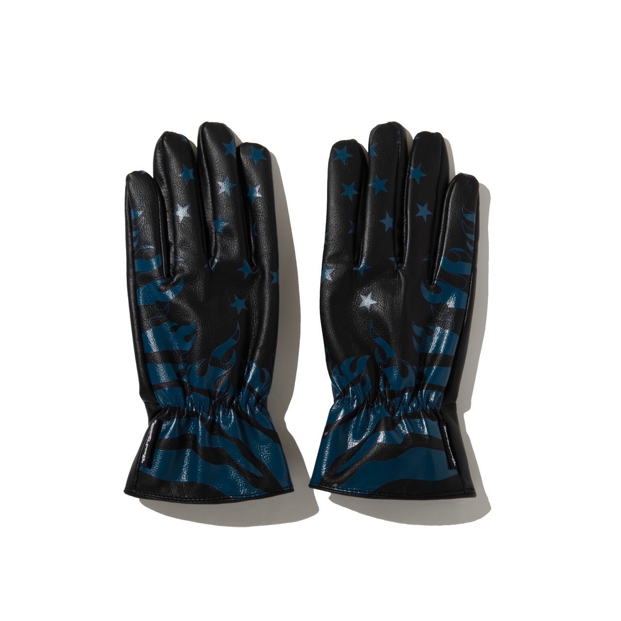 柔らかいカウハイドレザーに甲部分はオリジナルのファイヤーパターンとアメリカンフラッグを組み合わせた総柄をプリント。手首部分にはブランドロゴをプリントで配した。サイドにはピスネームを。オリジナルグローブの完成。